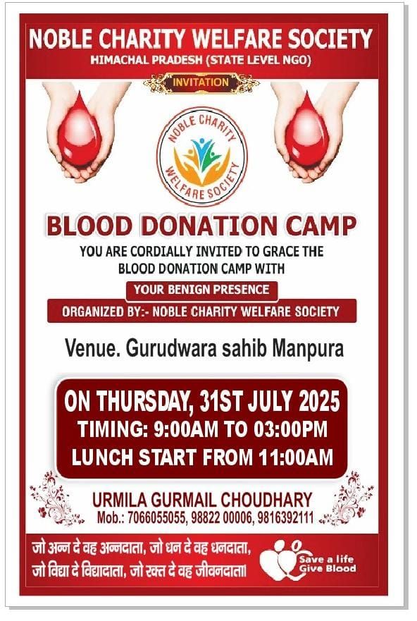 हिमाचल प्रदेश की राज्य स्तरीय स्वयंसेवी संस्था नोबल चैरिटी वेलफेयर सोसाइटी के तत्वावधान में 26वां राज्य स्तरीय रक्तदान शिविर आयोजित किया जा रहा है। यह शिविर 31 जुलाई (गुरुवार) को गुरुद्वारा साहिब, मानपुरा में सुबह 9:00 बजे से दोपहर 3:00 बजे तक आयोजित होगा।